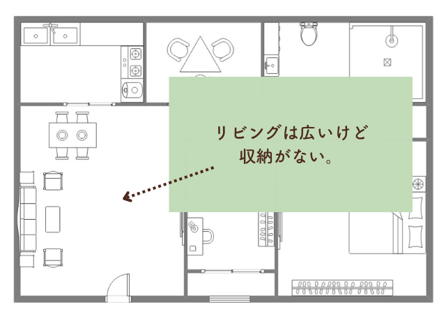 図面を見ていて感じることは、「リビングは広くスッキリさせたい」という希望の一方で、収納がほとんど設置されていない 間取りがとても多いこと。