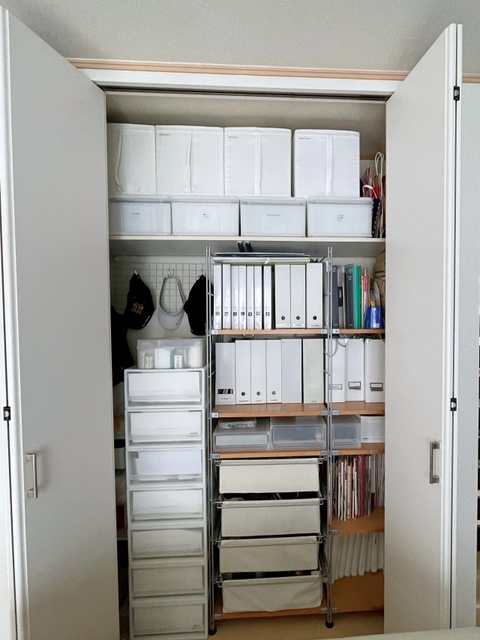 クローゼット内、上部には可動棚を設置し、下部には「無印」のシステムラック、引き出しケースを入れて生活で必要なものを収納しています。